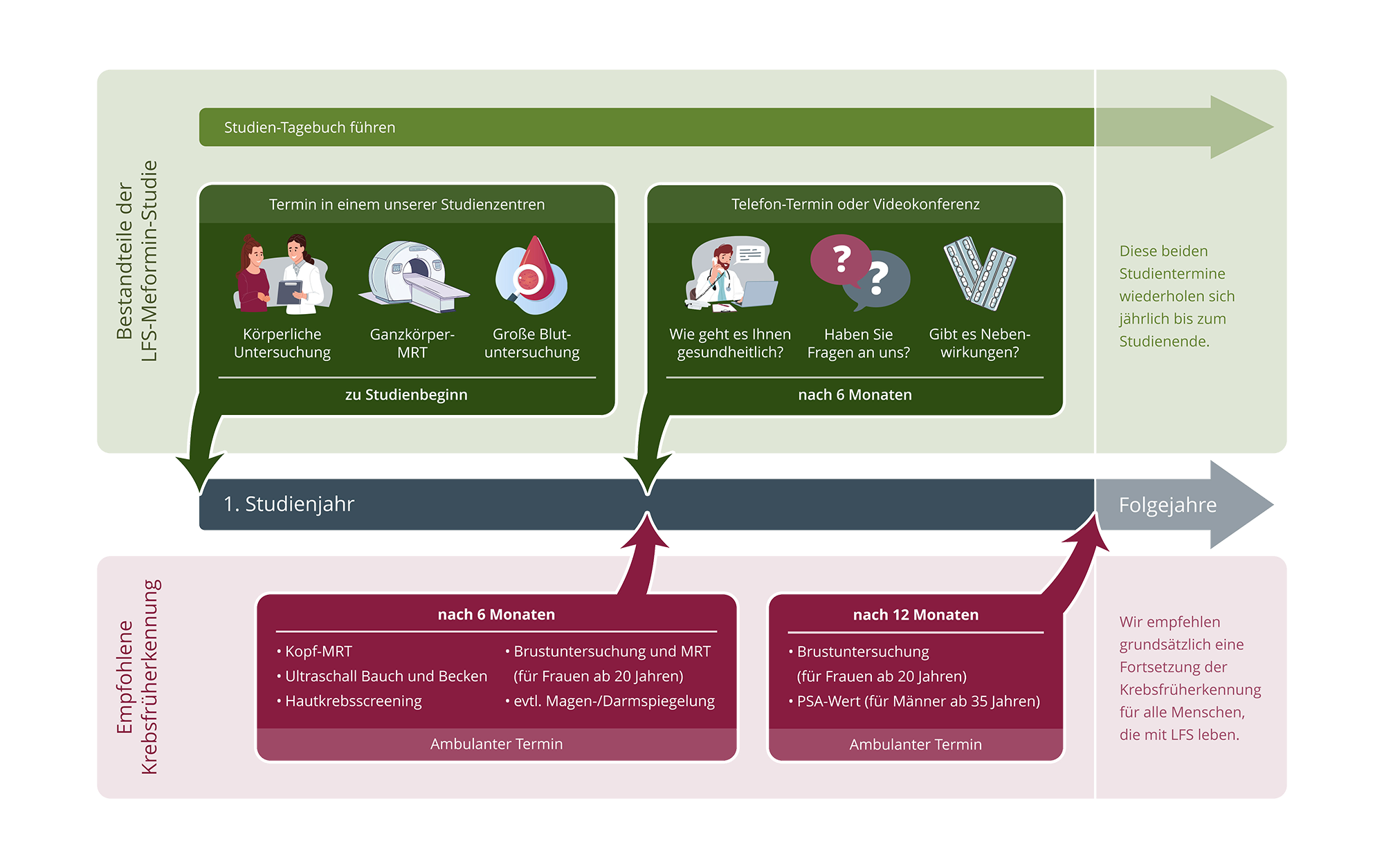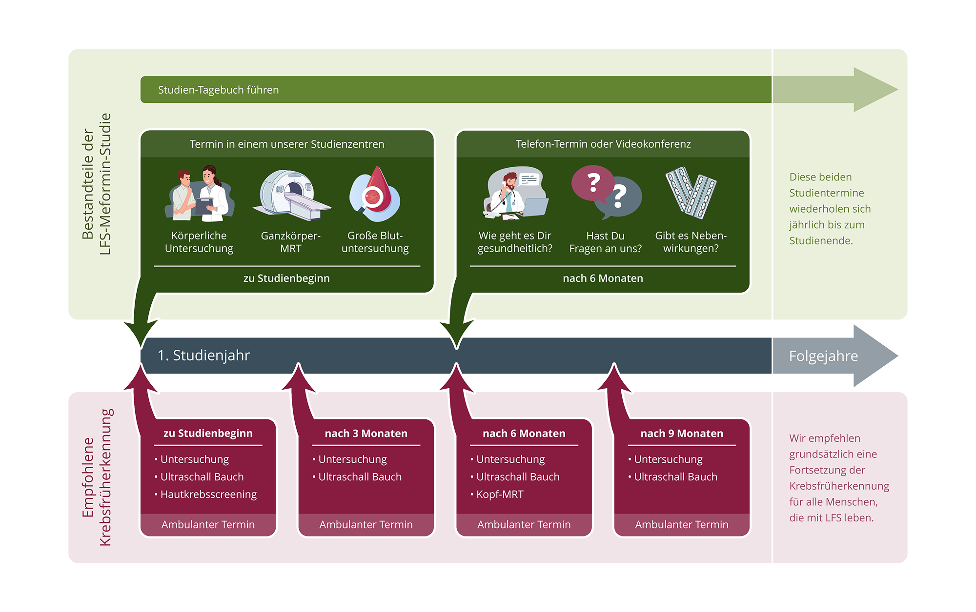 Menschen, die mit dem Li-Fraumeni Syndrom leben, haben in der Regel mehr ärztliche Termine als Menschen ohne LFS. Allein die dringend empfohlene Krebsfrüherkennung erfordert einiges an Zeitwaufwand. Wir sind uns dessen bewusst und haben daher den Zusatzaufwand für unsere Studie so gering wie möglich gehalten. Im weiteren Verlauf dieser Seite finden Sie zwei Schaubilder mit dem Studien-Terminkalender:
