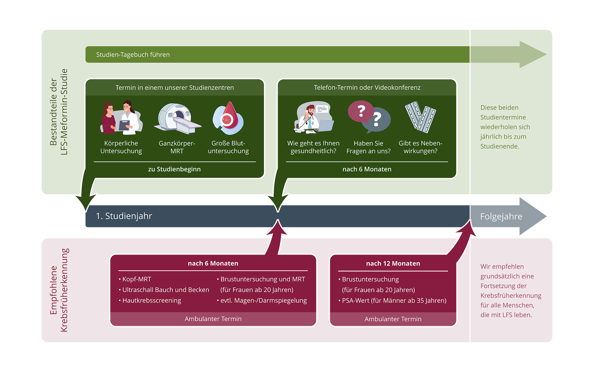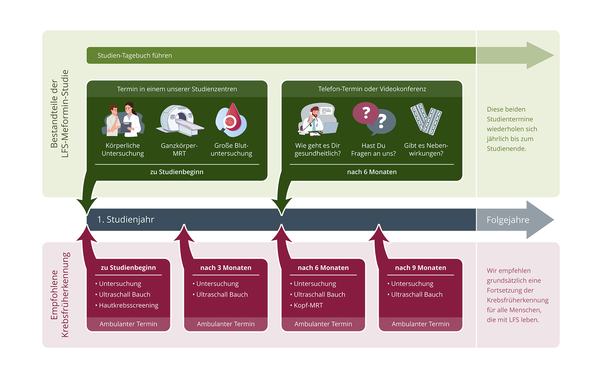 Menschen, die mit dem Li-Fraumeni Syndrom leben, haben in der Regel mehr ärztliche Termine als Menschen ohne LFS. Allein die dringend empfohlene Krebsfrüherkennung erfordert einiges an Zeitwaufwand. Wir sind uns dessen bewusst und haben daher den Zusatzaufwand für unsere Studie so gering wie möglich gehalten. Im weiteren Verlauf dieser Seite finden Sie zwei Schaubilder mit dem Studien-Terminkalender:
